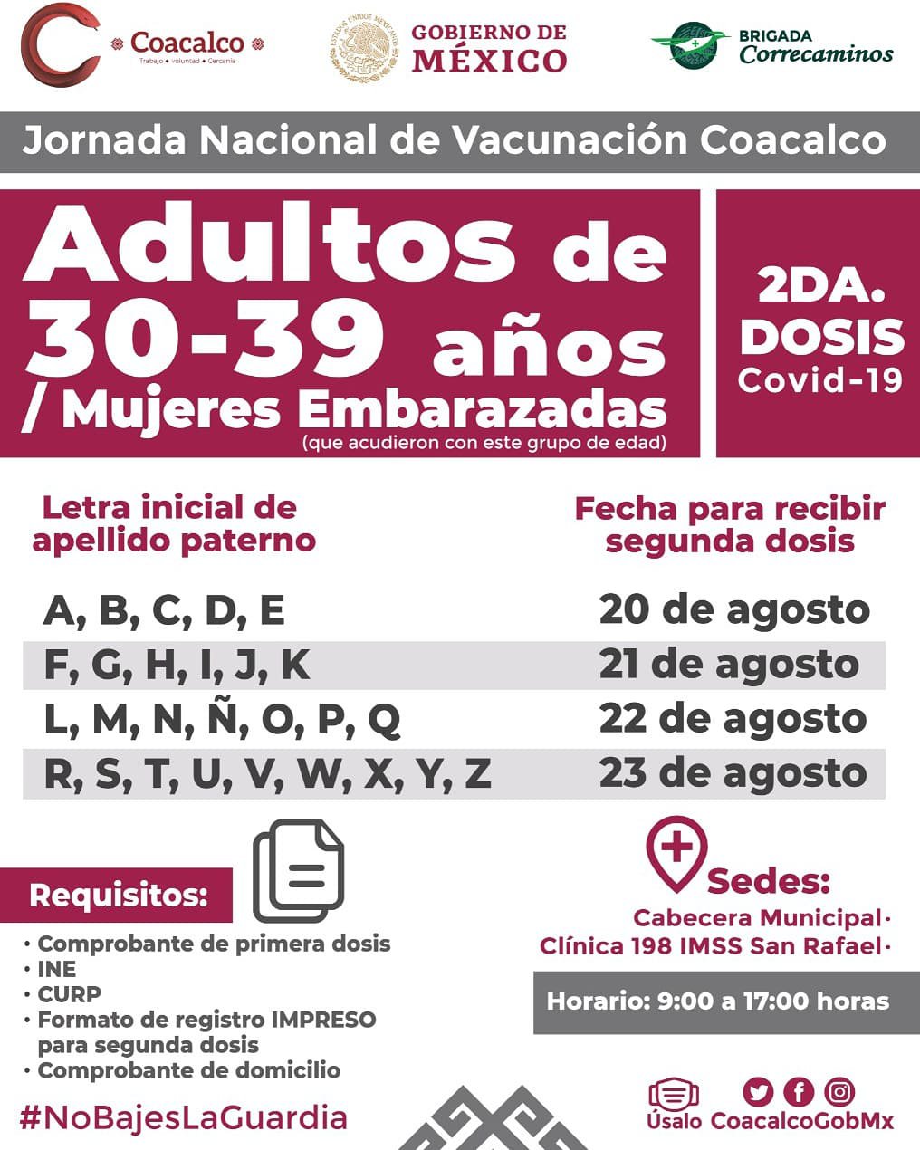 Coacalco, Méx.- El Gobierno de Coacalco informa que del viernes 20 al lunes 23 de agosto se realizará la aplicación de la segunda dosis de la Jornada Nacional de Vacunación para las y los coacalquenses que pertenezcan al segmento de la población de 30 a 39 años, así como a mujeres embarazadas mayores de 18 años que se inocularon con este segmento de edad.