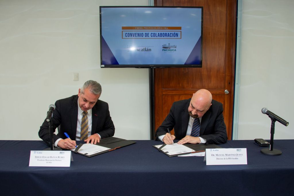 Santa Cruz Acatlán, Méx.- Con el objetivo de desarrollar actividades que contribuyan a mejorar las acciones, programas de gobierno y políticas públicas, la Facultad de Estudios Superiores Acatlán y el Ayuntamiento de Pachuca de Soto, Hidalgo llevaron a cabo la firma protocolaria del convenio de colaboración, en las Salas Académicas de esta unidad multidisciplinaria.