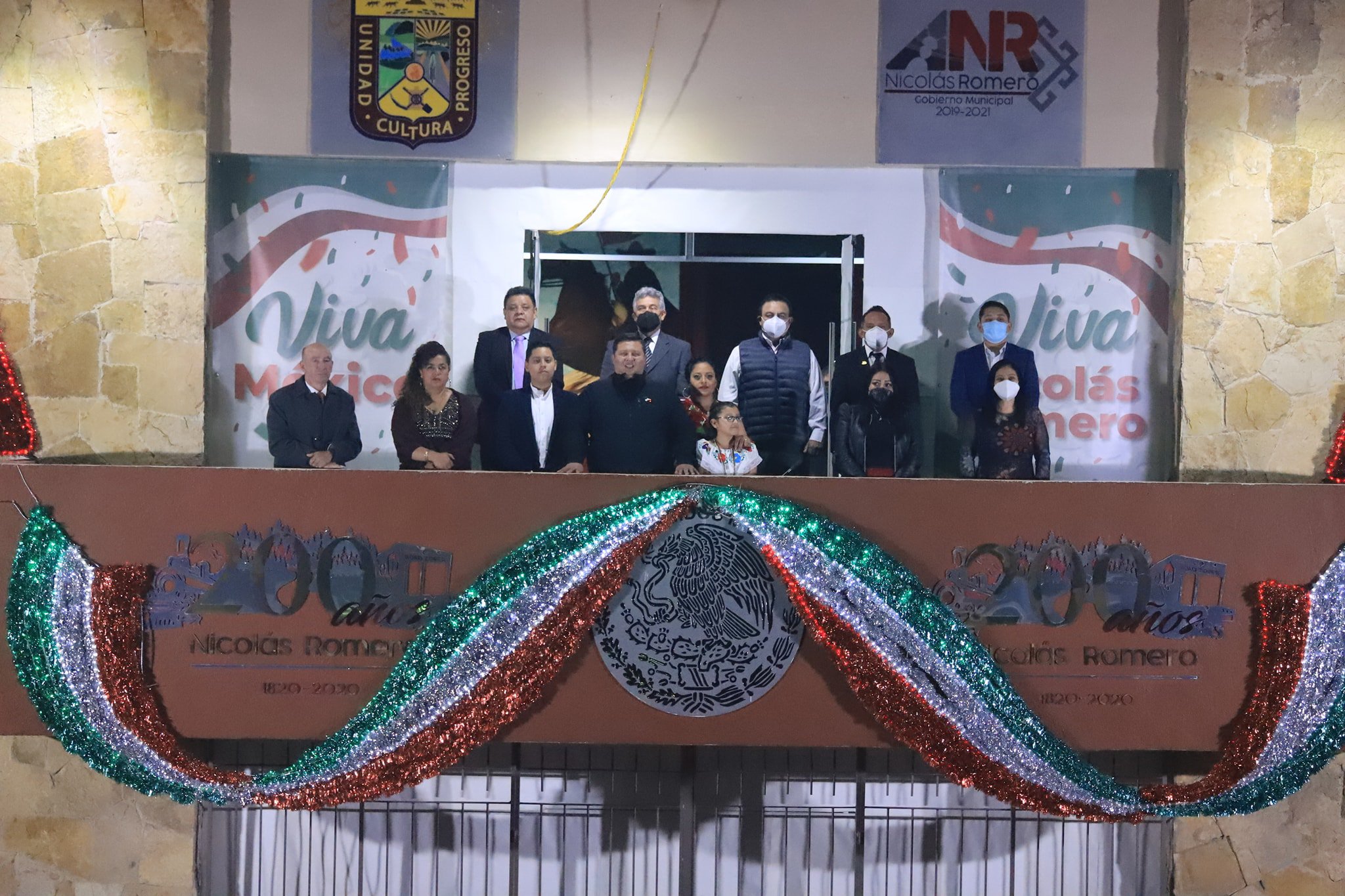 NICOLÁS ROMERO, Méx. – Al encabezar la conmemoración por el 211 aniversario del inicio del movimiento de Independencia de México y a escasos días de que se cumpla el bicentenario de la consumación de ésta (27 de septiembre 1821-27 de septiembre 2021), el alcalde Armando Navarrete López, expresó el orgullo de ser mexicanos y de pertenecer a Nicolás Romero, así como su deseo de que el fervor patrio, pueda vivirse como se acostumbraba anteriormente, una vez que pase la contingencia que actualmente se registra, por la enfermedad Covid-19. Durante la denominada “fiesta mexicana virtual” que fue transmitida por las redes sociales oficiales del gobierno municipal y que fue disfrutada por más de 16 mil familias, Armando Navarrete pidió a la ciudadanía no olvidar estas fechas, que recuerdan la lucha de los héroes que nos dieron patria y libertad. Acompañado de su esposa y presidenta del DIF local Anel Roa Vargas, funcionarios de la actual administración e integrantes del cabildo, el edil se trasladó hasta el balcón de Palacio Municipal para dar el tradicional Grito de Independencia, ante una explanada que a diferencia del tiempo anterior a la pandemia, se encontró libre de aglomeraciones, como medida para continuar con la aplicación de las medidas sanitarias, para la prevención de contagios de Covid-19. Al recibir el lábaro patrio de parte de la escolta conformada por elementos de la dirección de Protección Civil y Bomberos, Armando Navarrete, llevó a cabo la arenga, al grito de: “¡viva la independencia nacional!” “¡vivan los héroes que nos dieron patria!” “vivan los héroes que nos dieron libertad!” “¡viva Hidalgo!” “¡viva Morelos!” “¡viva Allende!” “¡viva la Corregidora!” “¡viva Aldama!” “¡viva Guerrero!” “¡viva la Cuarta Transformación!” “¡viva el municipio de Nicolás Romero!” “¡viva México!,” e hizo sonar la campana ubicada en el balcón de Palacio Municipal. Tras la interpretación del Himno Nacional Mexicano, se realizó una proyección de video maping, sobre el edificio de gobierno, que incluyó un recorrido histórico desde los orígenes del municipio, hasta la época actual, mostrando la evolución y progreso de Nicolás Romero, así como los símbolos patrios, al igual que las efigies de los principales próceres de la Independencia, además de fuegos artificiales que estallaron e iluminaron el cielo del primer cuadro del municipio. Por último, la celebración contó con la participación de la agrupación musical “Los Rodríguez” y durante la mañana de este 16 de septiembre, se colocó una ofrenda floral.