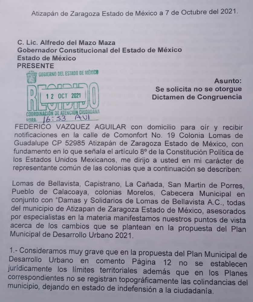 Los colonos mencionados, se reunieron con funcionarios del Gobierno del Estado de México, en respuesta a los 97 escritos presentados por lideres y ciudadanos atizapenses con copia a las autoridades estatales, así como escritos directos dirigidos al C. Gobernador Alfredo del Mazo Maza, a la Directora de Planeación Urbana Nina C Irazábal y a Ana Laura Martínez Moreno, Directora de Operación Urbana y Contralor Legislativo Juan José Hernández Vences.