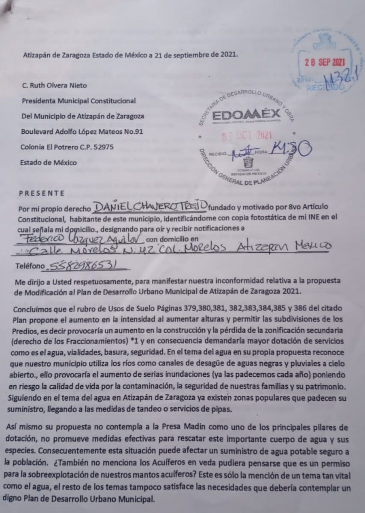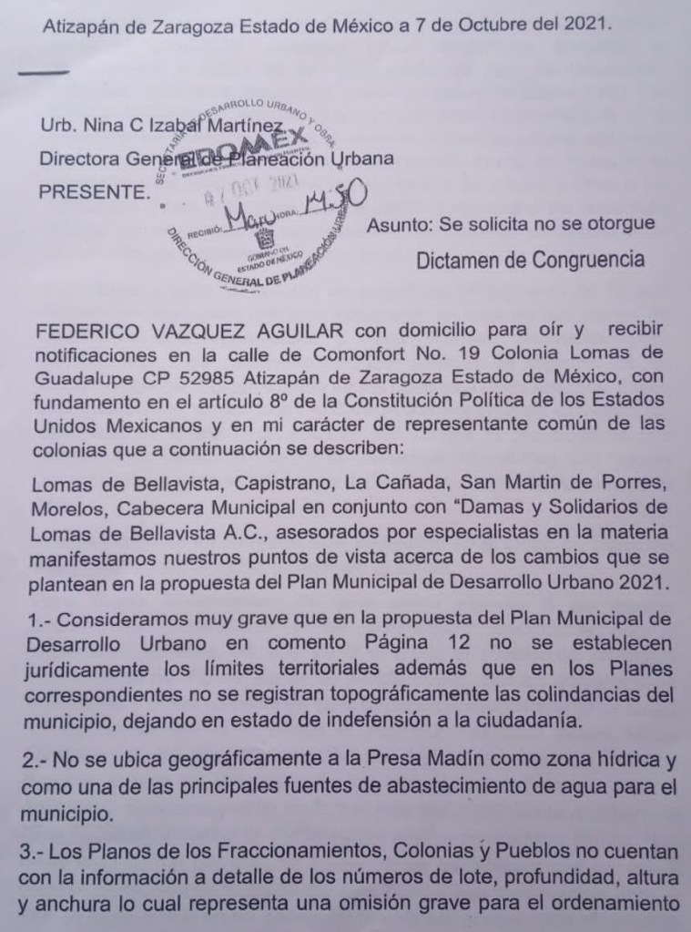 Dichos escritos notifican más irregularidades contenidas en el Plan Municipal de Desarrollo Urbano 2021, las cuales, a decir de los colonos “son muy graves”.