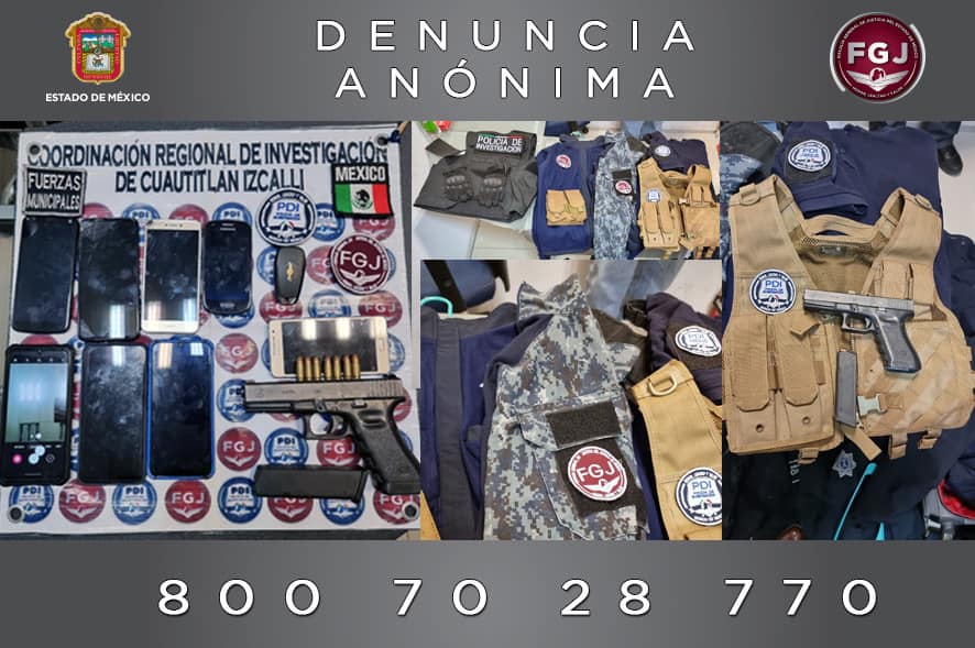 Además les fue asegurada un arma de fuego calibre 9 mm, con cargador abastecido con siete cartuchos útiles, ocho teléfonos de diferentes marcas y modelos, una mochila con ropa táctica con insignias de la FGJEM y de la policía Municipal de Coyotepec.