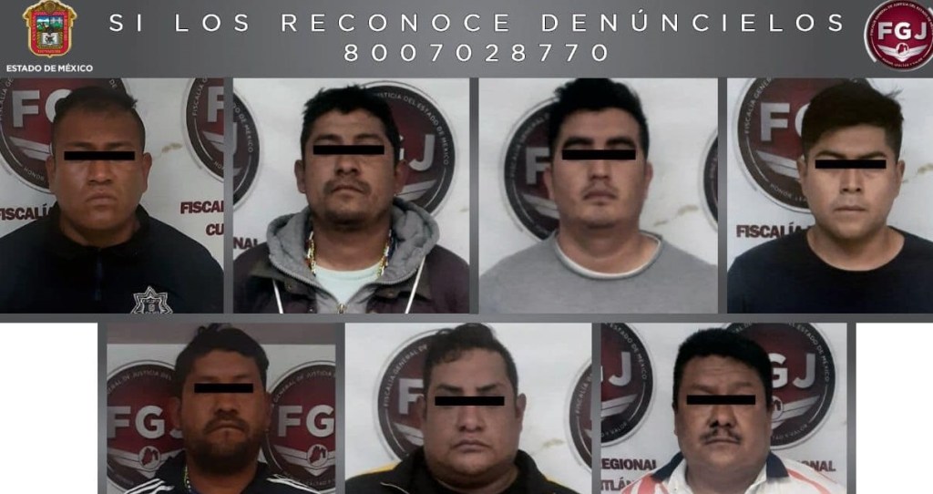 Se trata de Oswaldo “N” de 38 años de edad, Edmundo “N” de 34 años, Raúl “N” de 43 años, Alejandro “N” de 27 años, Carlos Adrián “N” de 30 años, Carlos Alberto “N” de 30 años y Eduardo Emanuel “N” de 27 años, este último quien se desempeñaba como elemento de Seguridad Pública Municipal de Coyotepec.