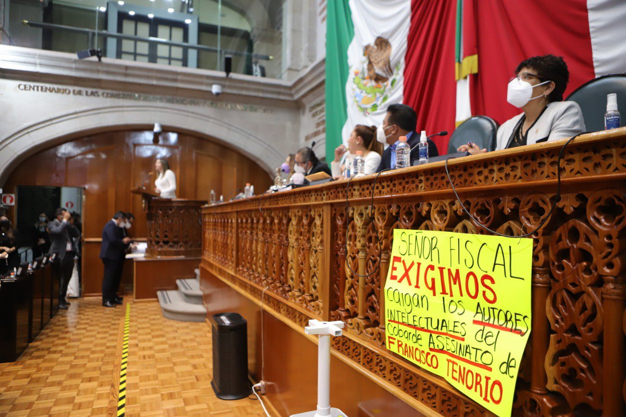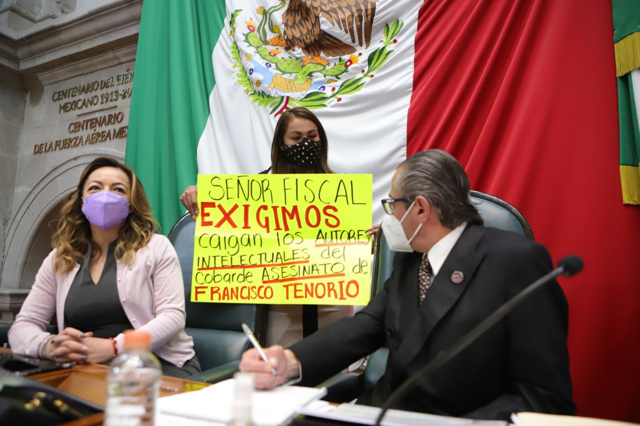 Durante la sesión del pleno, la diputada Yesica Rojas Hernández, del Distrito 27 subió a un costado de la mesa directiva, con una cartulina donde exigió al Fiscal Justicia, y la detención de los autores intelectuales del homicidio de su esposo Francisco Tenorio, ex alcalde de Valle de Chalco, ocurrido el 29 de octubre de 2019.