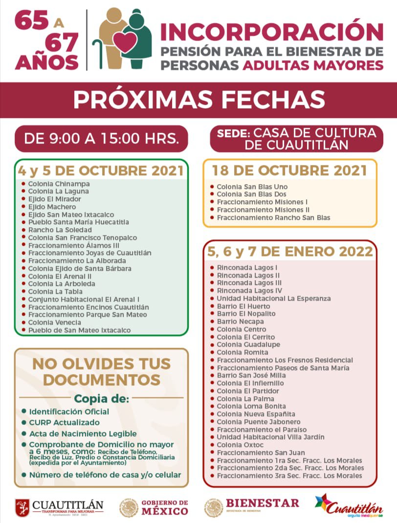 Cuautitlán, Méx.- Las personas de 65 a 67 años de edad podrán incorporase al programa de Pensión para el Bienestar de adultas mayores este 4 y 5 de octubre, en las instalaciones de la Casa de la Cultura del Cuautitlán, como parte de las acciones emprendidas por el gobierno federal.