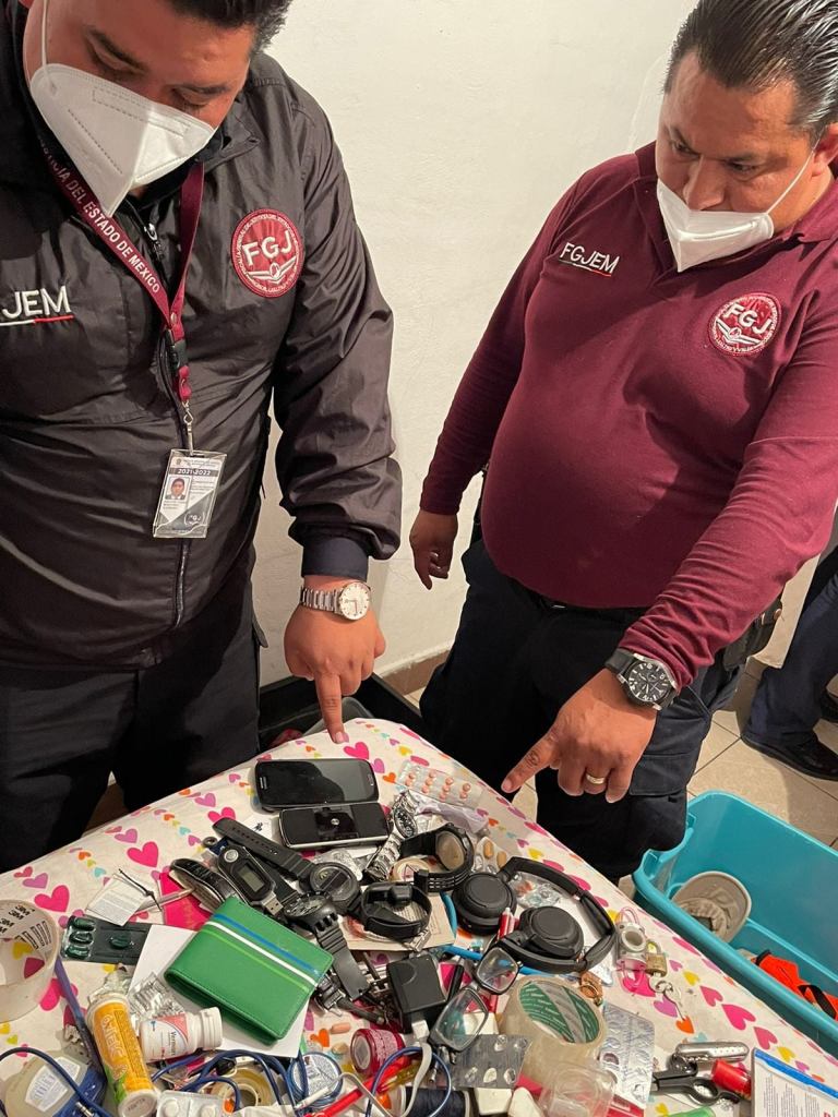 Con el avance en la indagatoria fue posible ubicar y detener a Jorge David “N”, sujeto que el día de lunes 1 de noviembre fue vinculado a proceso por los delitos de robo con violencia a transporte público y homicidio calificado en grado de tentativa. Al continuar con estas investigaciones el Representante Social solicitó a la Autoridad Judicial librar una orden de cateo para un inmueble ubicado en la colonia Cuauhtémoc, en el municipio de Tlalnepantla, vivienda al parecer habitada por el sujeto detenido. Una vez que este mandamiento judicial fue otorgado elementos de la FGJEM se trasladaron al sitio, en donde fue hallado lo siguiente: Un tarjetón de la ruta ACPTA 27 II Miguel Hidalgo; Una caja de celular marca Moto G, el cual por el número de IMEI se estableció que tiene reporte de robo; Una tarjeta de circulación de una motocicleta marca Italika; Dos licencias para conducir; Una credencial de elector; Una tarjeta bancaria; Tres carteras; Cinco relojes de diferentes marcas y modelos; Una bocina marca Motorola; Un teléfono celular marca Samsung; Dos mochilas tipo cangureras color café; Tres mochilas; Una camisola y una gorra con la leyenda Delegación Gustavo A. Madero; Una camisola con la leyenda Pemex Refinación; Un chaleco color naranja fluorescente Todos estos objetos fueron asegurados por personal de esta Fiscalía Estatal, así como una sección del inmueble cateado.