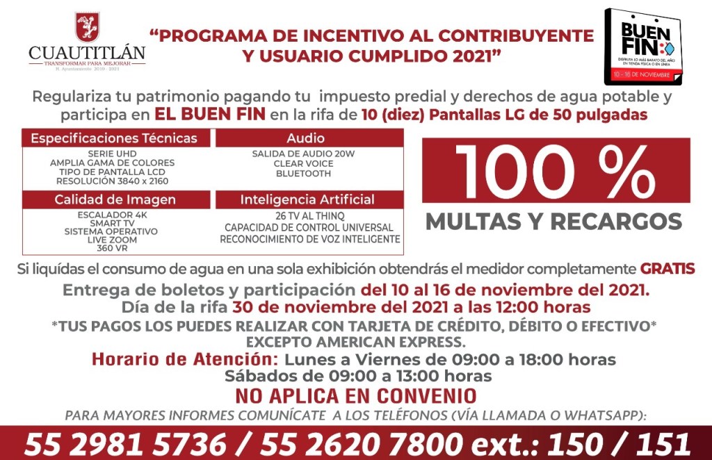 Este 2021 se verán beneficiados con la obtención del 100 por ciento de descuento en multas y recargos, además participan en el BUEN FIN con la rifa de 10 pantallas de 50 pulgadas.