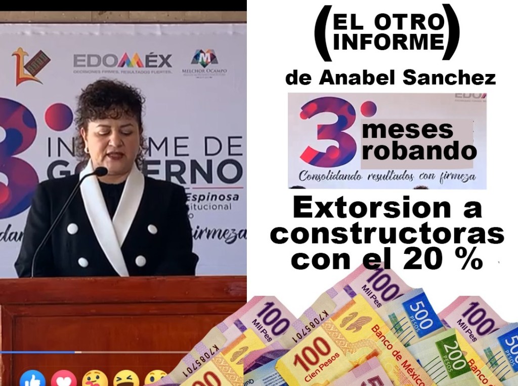 Es de mencionar que empleados municipales y empresarios de la construcción, revelaron a esta casa editorial, que además de estar desfalcando las arcas públicas de Melchor Ocampo la pseudo licenciada Anabel Sánchez Espinosa y “sus amigos”, están extorsionando a los representantes de las constructoras hasta con un 20 y 30 por ciento para pagarles. Acciones que van en detrimento de la política de quien fuera Presidenta Municipal Constitucional en dos ocasiones, Miriam Escalona Piña, actual diputada local.
