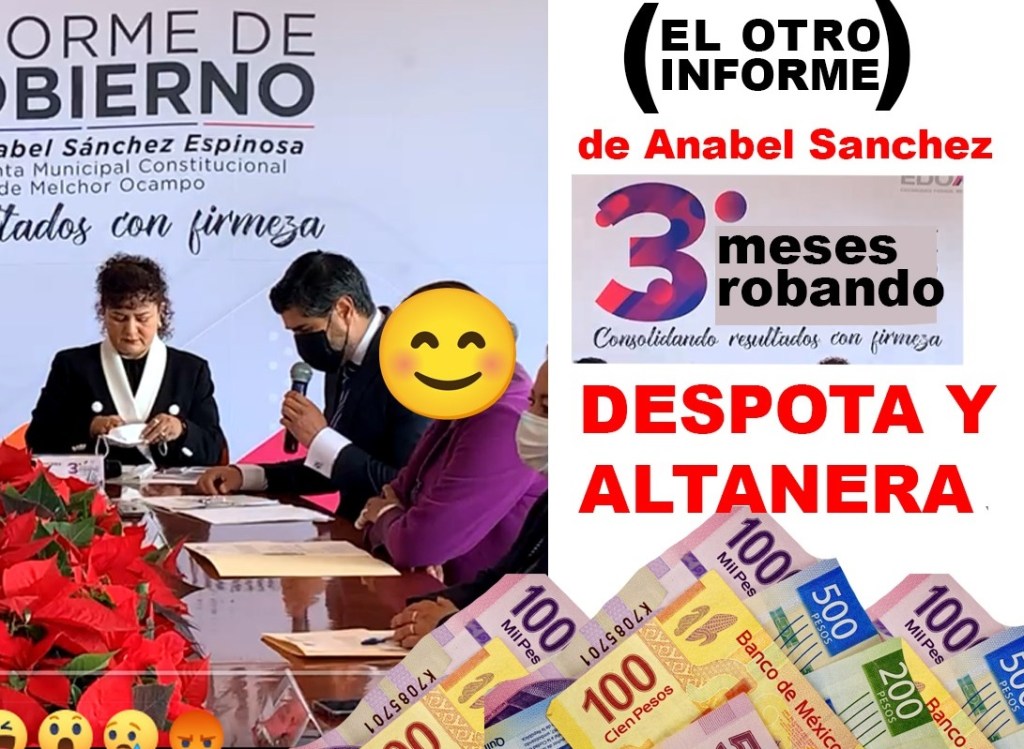 Anabel Sánchez Espinosa, (a) “la muñeca diabólica” como le apodan a la actual mandataria de Melchor Ocampo, en contubernio con el Tesorero, Benito Medina Martínez; el síndico municipal, Raúl Ramírez Pérez y el Secretario del H. Ayuntamiento, Francisco Manuel Núñez Esquivel, se han aprobado una jugosa cantidad de dinero para su aguinaldo y finiquito de más de millón y medio de pesos (esta cantidad sólo para -Anabel-).