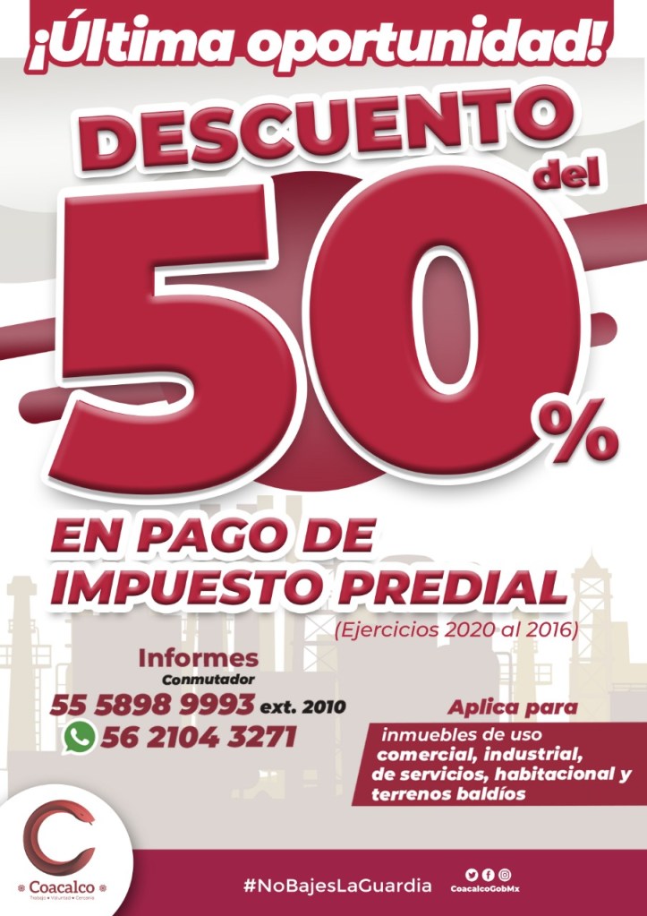Quienes deseen ser beneficiarios de este apoyo, pueden solicitar mayor información en el teléfono 55 5898 9993 extensión 2010, así como en el WhatsApp 56 2104 3271, en la página oficial de coacalco.gob.mx y en el correo liquidacionespredial@coacalco.gob.mx