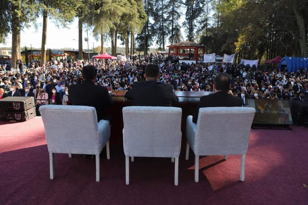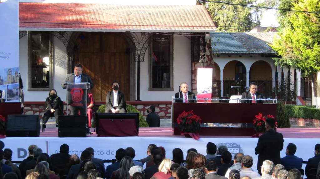 Durante la Séptima Sesión Solemne de Cabildo, realizada en la comunidad de San Juan de las Tablas y ante Carlos Preza Millán, subsecretario de Movilidad del gobierno estatal y representante personal del gobernador Alfredo Del Mazo Maza, mismo que se encargó de tomarle la protesta, el munícipe precisó que la Cuarta Transformación seguirá fortaleciéndose en la demarcación.