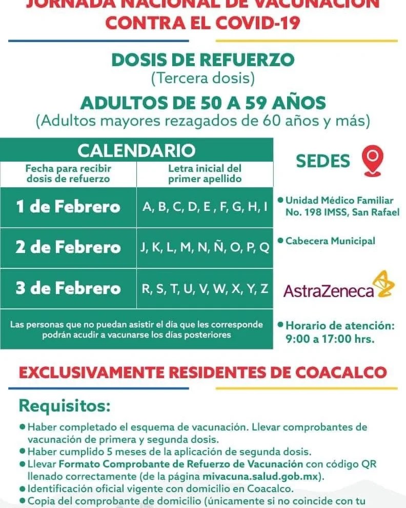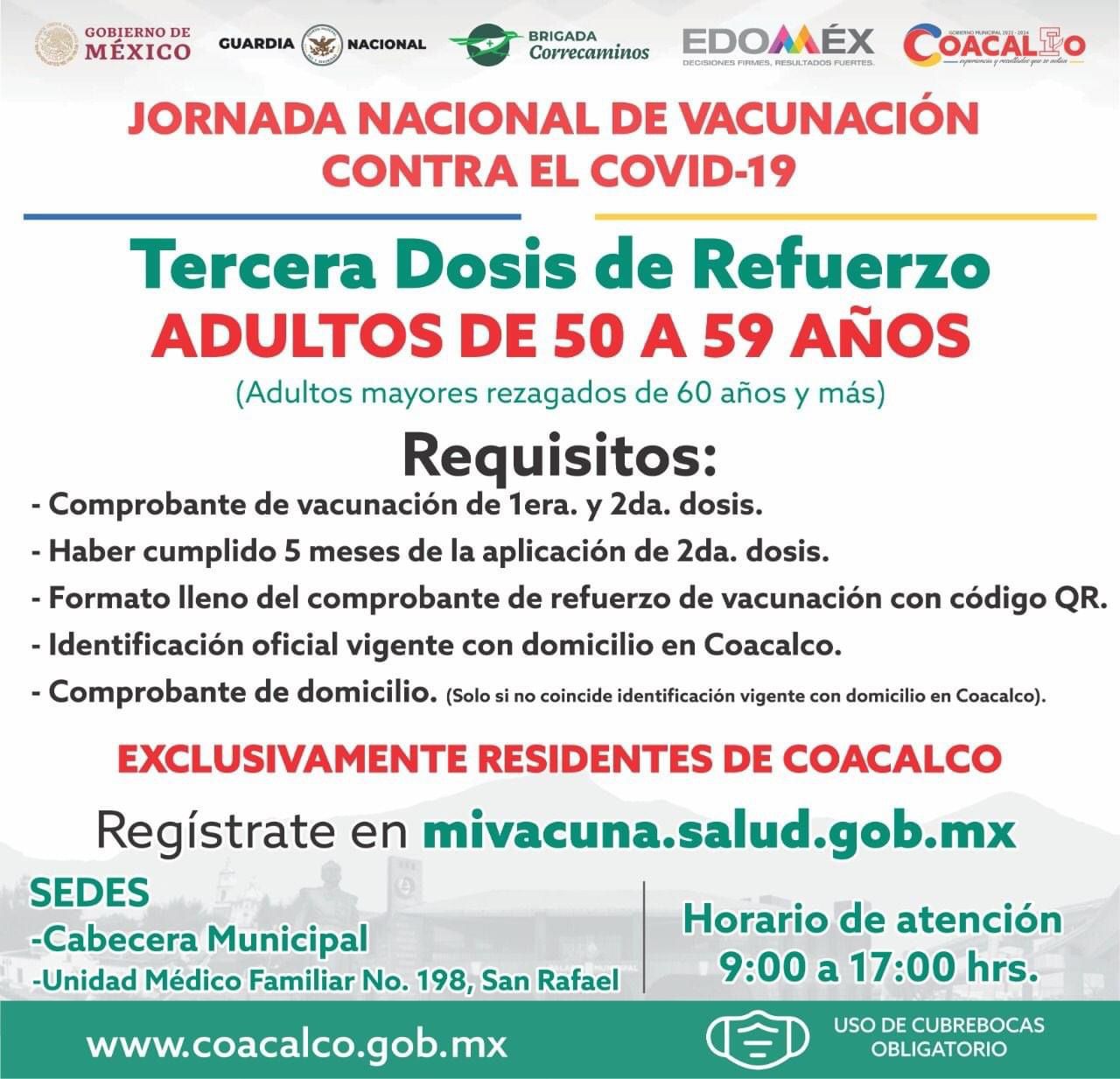 Coacalco, Méx.- Autoridades de los Gobiernos de México, el Estado de México y en coordinación con el Ayuntamiento de Coacalco, iniciarán con la aplicación de la dosis de refuerzo contra Covid-19, a personas adultas de 50 a 59 años y adultos mayores rezagados de 60 años y más, a partir del martes 1 de febrero.