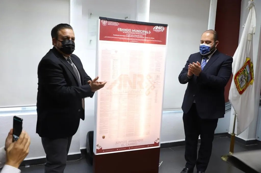 Nicolás Romero, Méx.- Con fundamento en lo dispuesto por los artículos 31 fracción 1, 48, fracción 1, 48 fracción III, 160, 161, 162, 163, 164 y 165 de la Ley Orgánica Municipal del Estado de México, se realizó la develación del Bando Municipal, que contribuye a fortalecer el tejido social y a tener una sociedad más armónica, además de que es una herramienta esencial para responder a las demandas y necesidades de la población.