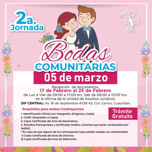 El próximo 5 de marzo. El DIF de Cuautitlán invita a la Segunda Jornada de “Bodas Comunitarias”