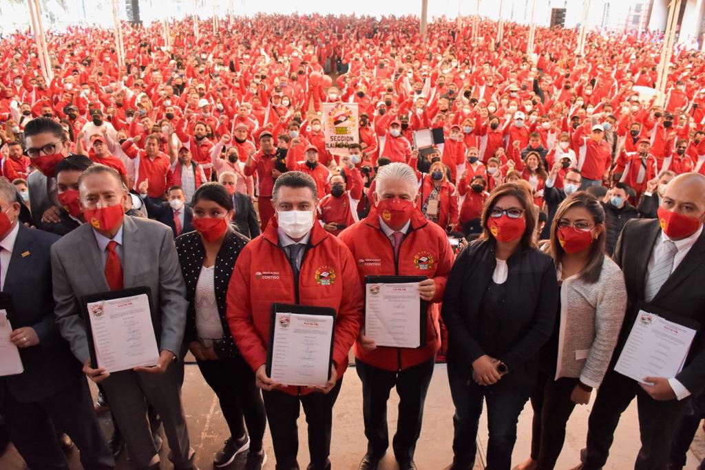 Ante la base sindical reunida en la Plaza “Doctor Gustavo Baz”, el Presidente Municipal afirmó que con este acuerdo cumple su palabra empeñada en campaña de mejorar las condiciones salariales y laborales de los servidores públicos del gobierno a su cargo.