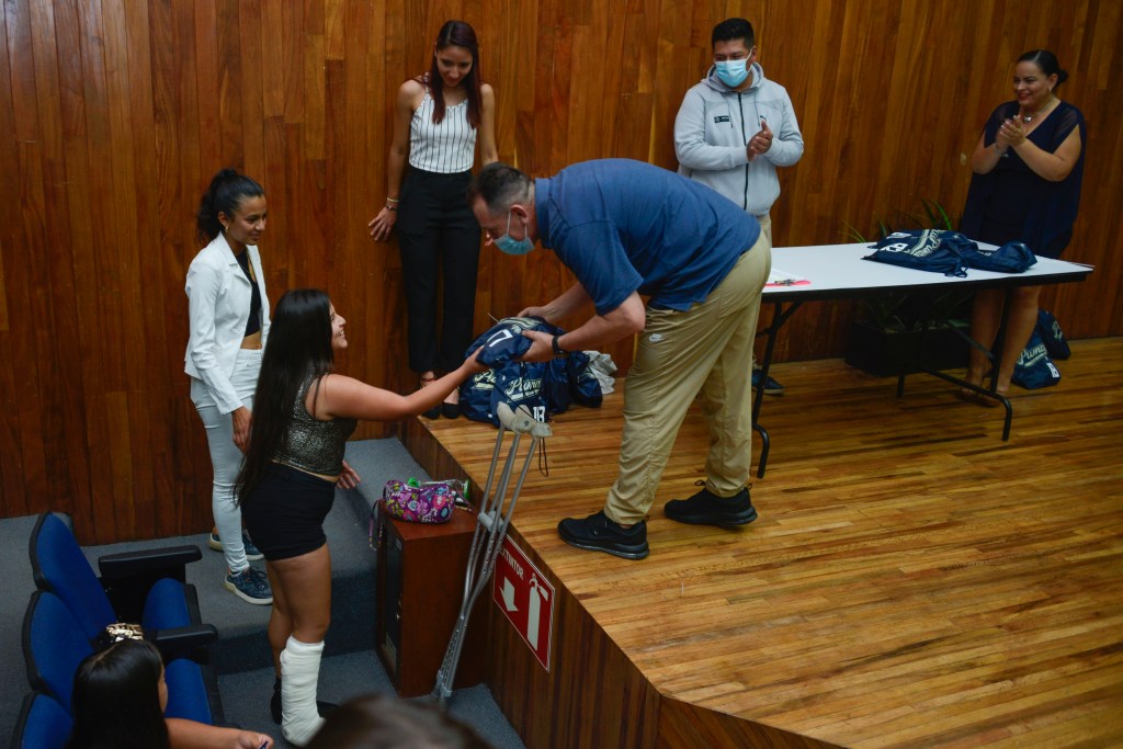Acompañada por el Coordinador de Actividades Deportivas y Recreativas, ingeniero Gabriel López Campos, el Head Coach de Pumas Acatlán, Horacio García Aponte, Pedro Álvarez Villanueva, entrenador en jefe del equipo de Flag Femenil, y ante la presencia de padres de familia, jugadores de Liga Mayor y Juvenil, Castorena López dio la bienvenida y agradeció a las niñas y jóvenes que portarán por primera vez los colores “azul y oro”.