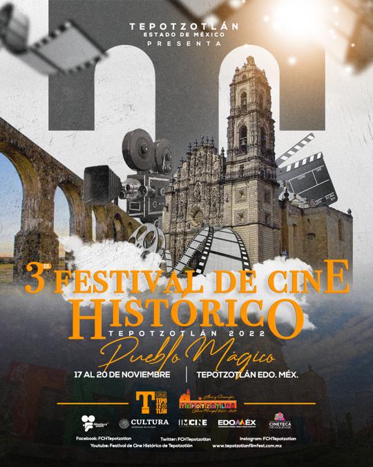 Tepotzotlán, Méx.- La tercera edición del FCHTepotzotlán se llevará a cabo del 17 al 20 de noviembre del 2022 en lugares emblemáticos de este Pueblo Mágico y tendrá el reto de consolidarse como el Festival de Cine mexiquense por excelencia. Para este año se contempla nuevamente repetir sedes que se han convertido en lugares icónicos para este evento anual: Explanada Municipal, Panteón del barrio de Texcacoa, Patio de la Casa de Cultura y salones de este mismo recinto. Todavía no se confirma pero se buscará reintegrar otras dos sedes que participaron en la primera edición, Arcos del Sitio y Patio de la Hostería del Convento.