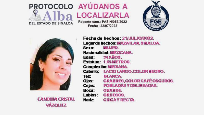 La Fiscalía General del Estado de Sinaloa, informó de manera oficial que la necropsia practicada por ley y diversos exámenes periciales no dieron resultados que coincidieran con los de la también locutora, por lo que Cándida Cristal Vázquez, aún se considera como desaparecida, desde el 21 de julio.