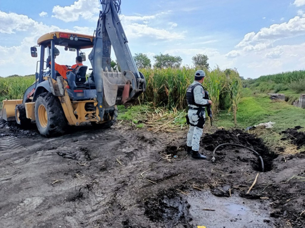 Un hallazgo más fue en el municipio de Huichapan, en un terreno de cultivo de maíz, donde personal de la Guardia Nacional localizó una toma clandestina para sustracción de combustible conectada al poliducto Tula-Salamanca.