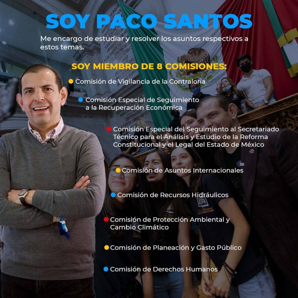 Es de mencionar, que el congresista por el distrito local XXVI, Francisco Javier Santos Arreola, se encarga de estudiar y de resolver los asuntos respectivos de temas en ocho comisiones, entre estas la comisión de vigilancia de la contraloría comisión especial de seguimiento a la recaudación económica; comisión especial de seguimiento al secretariado técnico para el análisis y estudio de la reforma constitucional y el legal del Estado de México; comisión de asuntos internacionales; comisión de recursos hidráulicos; comisión de protección ambiental y cambio climático; comisión de planeación y gasto público; comisión de Derechos Humanos, entre otros.