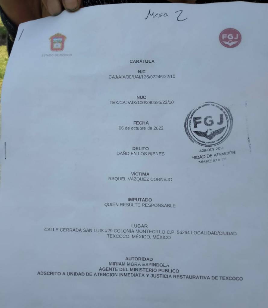Manifestó que al acudir al Ministerio Público para realizar la denuncia correspondiente por la agresión y el incendio y al señalar a su hermano se levantó carpeta TEX/CAJ/AIX/100/290695/22/10; sin embargo, los servidores públicos se negaron a colocar el nombre de su familiar y fue iniciada en contra de “quien resulte responsable”.