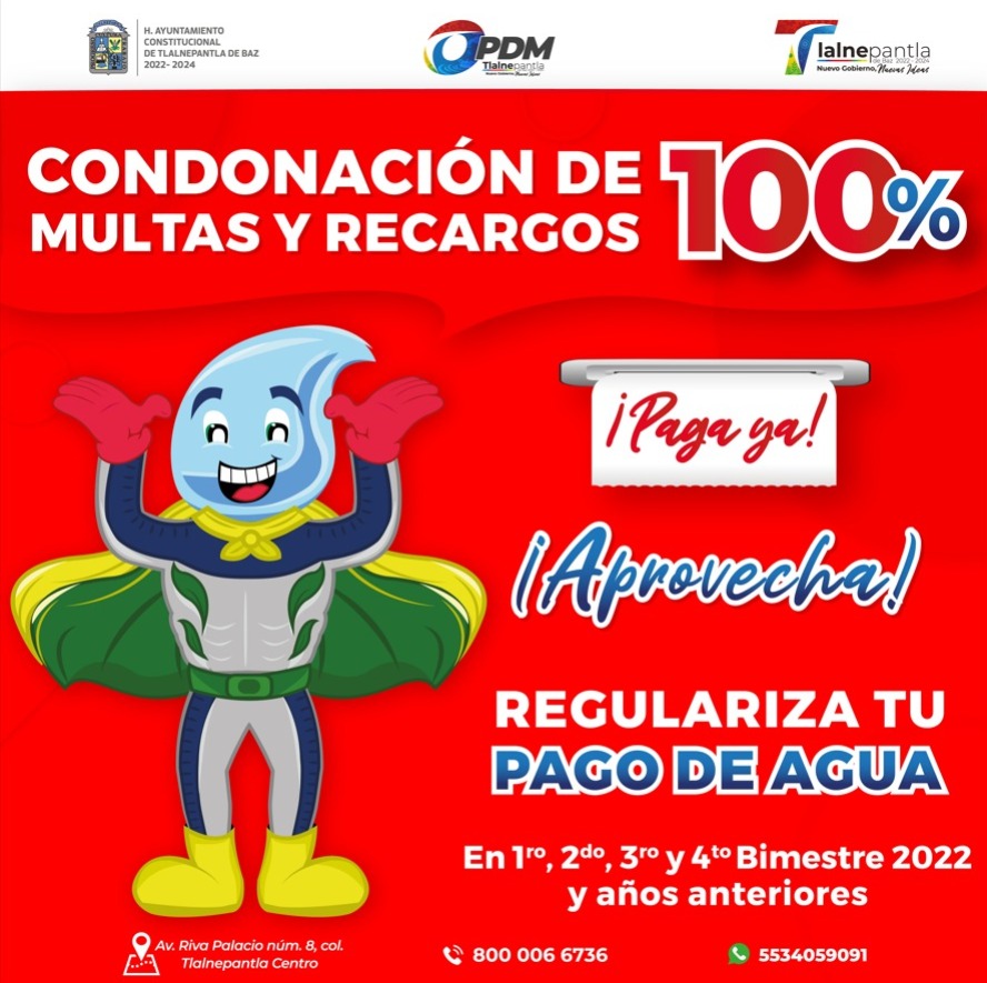 Tlalnepantla, Méx.- El alcalde de Tlalnepantla de Baz, Marco Antonio Rodríguez Hurtado, en conjunto con el Cabildo, aprobaron la campaña de Condonación de Multas y Recargos al 100% en el pago del agua para el primero, segundo, tercero y cuarto bimestre del 2022, anteriores a fin de que, las y los tlalnepantlenses, puedan regularizar su pago por el suministro del vital líquido y así apoyar a las familias de la ciudadanía.