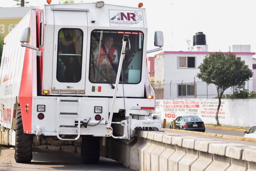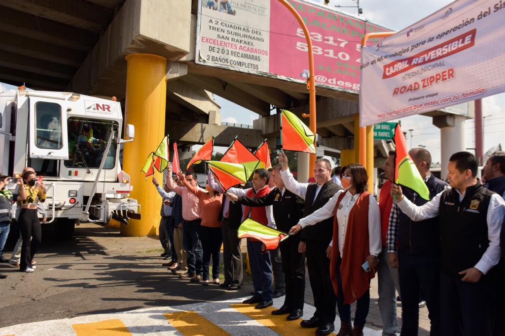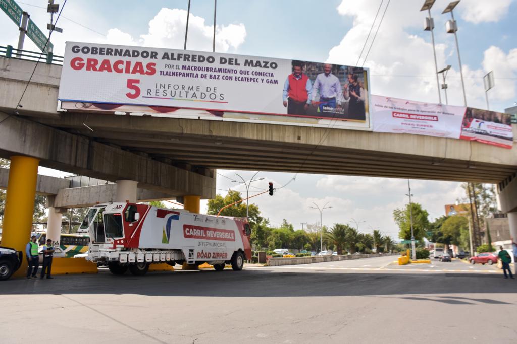 Tlalnepantla, Méx.- Para disminuir tiempos de traslado, evitar más contaminación ambiental, reducir horas/hombre en la llegada a los centros de trabajo y escuelas, así como mejorar la movilidad en la zona metropolitana del Valle de México, el Gobierno de Tlalnepantla puso en marcha la primera etapa del programa Road Zipper a fin de habilitar un carril reversible en la avenida Mario Colín, desde Radial Toltecas hacia avenida de los Maestros.