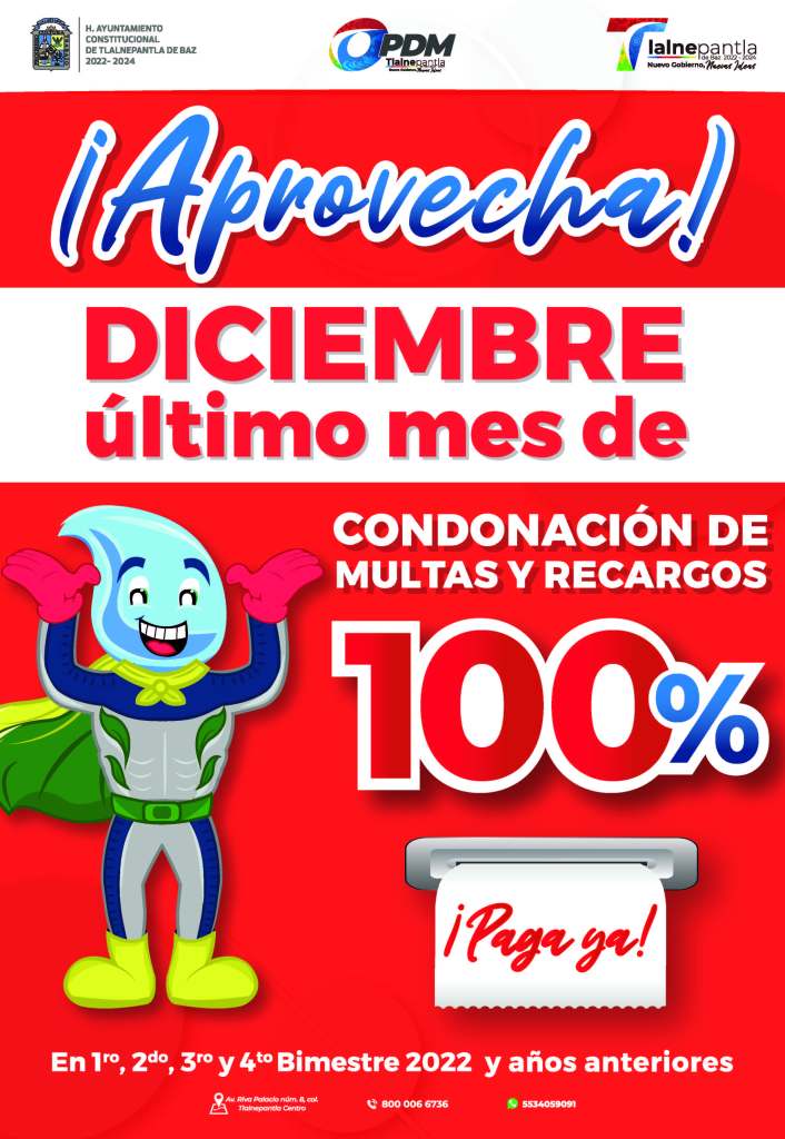 Tlalnepantla, Méx.- El alcalde Tony Rodríguez le recuerda a las y los tlalnepantlenses que aún pueden acercarse al OPDM para aprovechar la condonación de multas y recargos del 100 por ciento en su pago de agua durante el mes de diciembre.