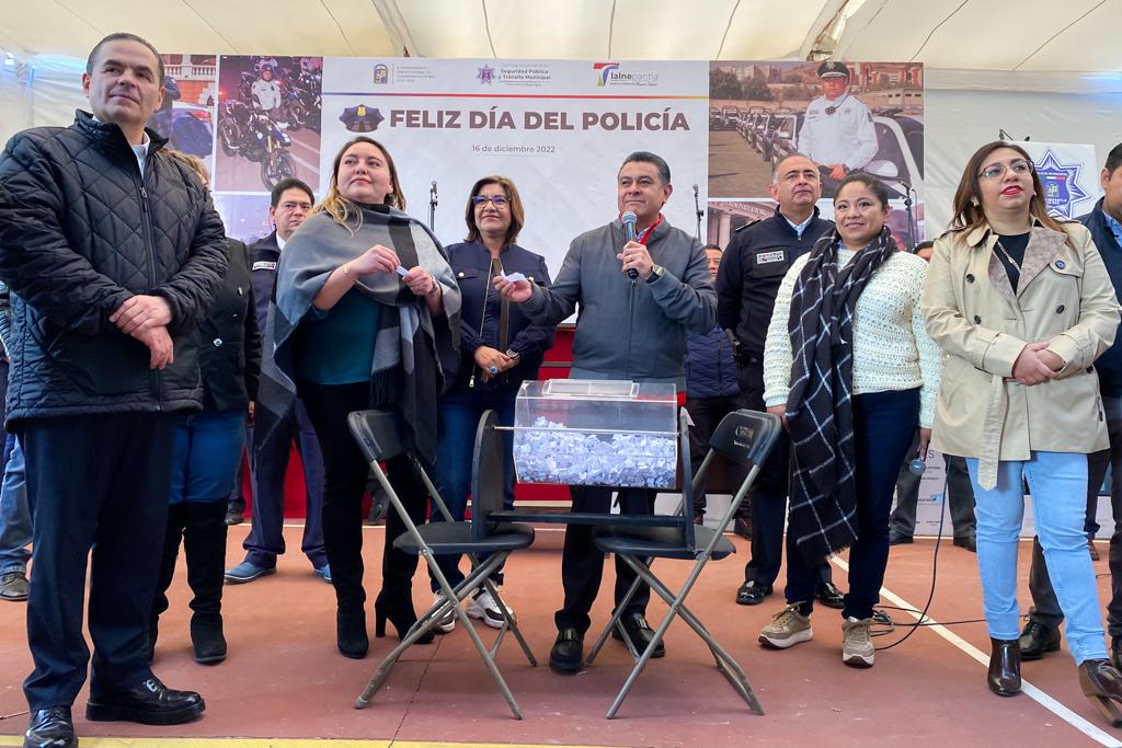 Con motivo del Día del Policía, el Gobierno de Tlalnepantla rifó decenas de regalos entre ellos un automóvil. *** En este primer año de Administración se han alcanzado grandes resultados en beneficio de la población.