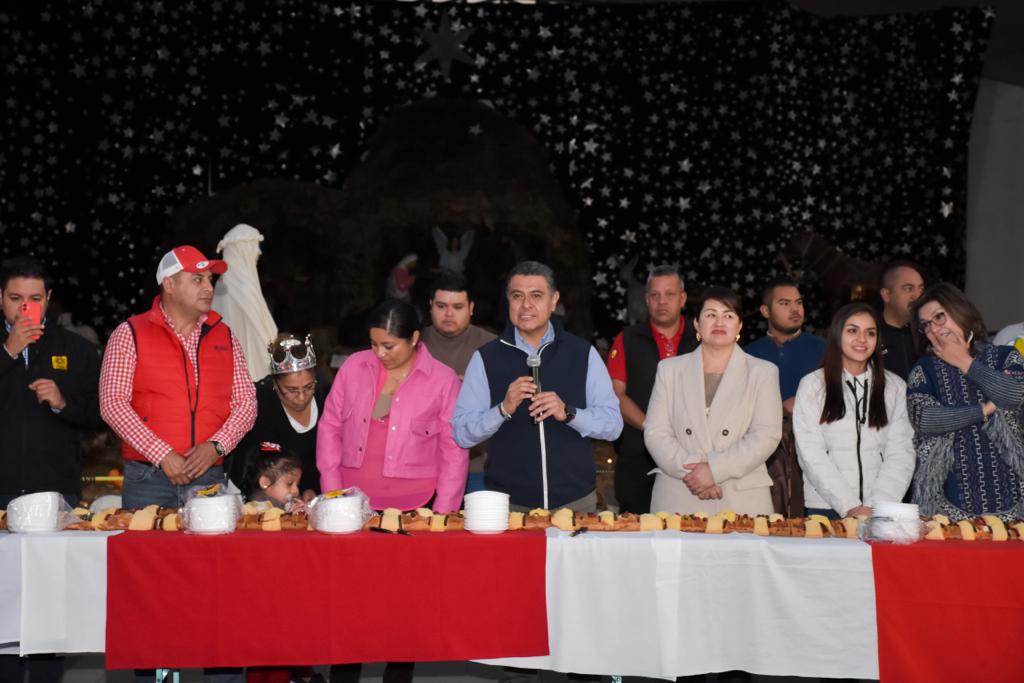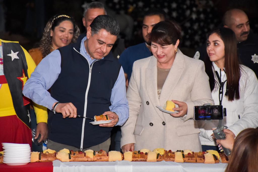 Para cerrar esta jornada de trabajo, Tony Rodríguez, acompañado de su esposa, integrantes del Cuerpo Edilicio y directores de la Administración, partieron una mega rosca de reyes, la cual fue donada por grupo Azinsa, con el objetivo de mantener viva esta tradición y fomentar la convivencia familiar.