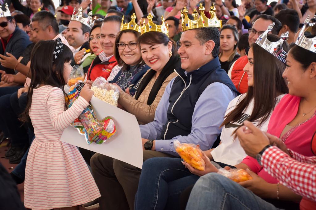 Tlalnepantla, Méx.- En este Día de los Reyes Magos, el Alcalde Marco Antonio Rodríguez Hurtado y la Presidenta Honoraria del DIF local, María Gómez Martínez continuaron llevando sonrisas a los “reyes de la casa” por distintas colonias de Tlalnepantla, además de que encabezaron la tradicional partida de rosca en la Explanada Municipal.
