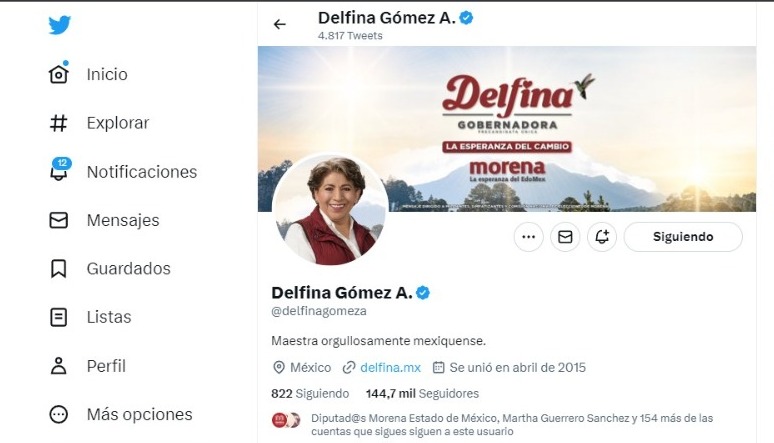 Al realizar una revisión de las cuentas de Facebook y Twitter observamos que la cuenta oficial de Facebook de la maestra Delfina Gómez Álvarez tiene 413 mil seguidores, mientras que en su cuenta de Twitter tiene 144,7 mil seguidores, informó en entrevista.