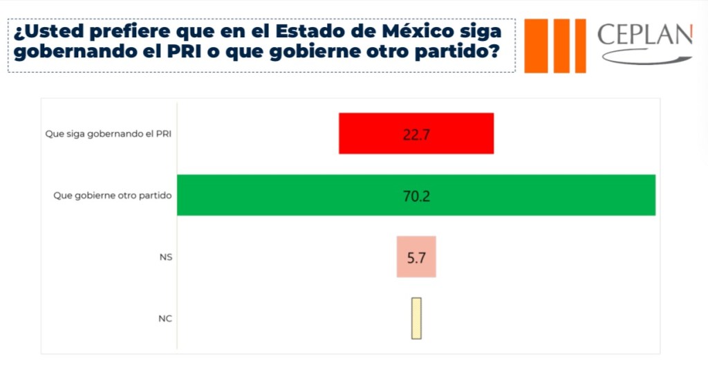 En la encuesta levantada por el CEPLAN, el 70 por ciento de los mexiquenses desea que otro partido gobierne el Estado de México, mientras que el 40 por ciento dijo que nunca votaría por los mismos de siempre.