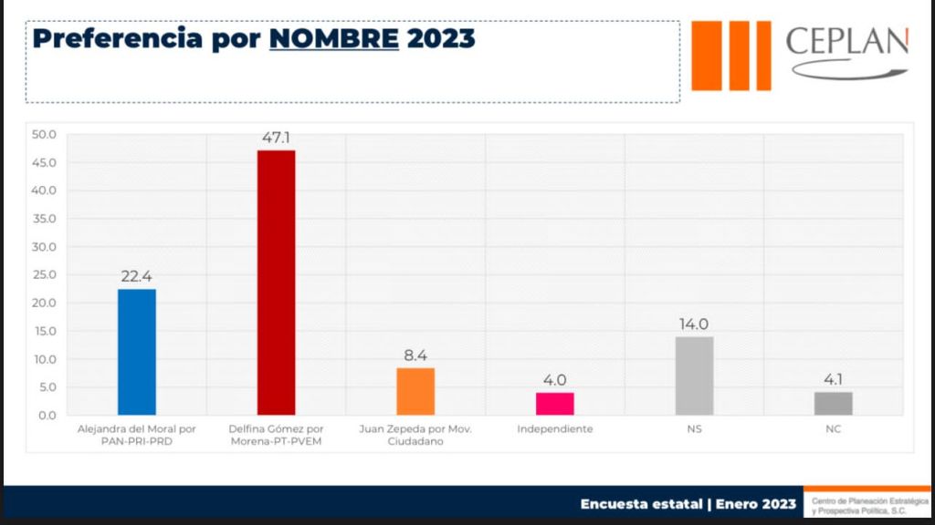 En el estudio, hecho por el Centro de Planeación Estratégica y Prospectiva Política (CEPLAN), la maestra Delfina Gómez cuenta con el 47.1 por ciento de intención de voto de los mexiquenses, mientras que la aspirante que representa al viejo régimen, apenas alcanza el 22.4 por ciento.