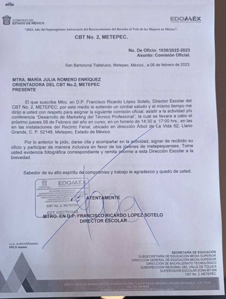 De acuerdo con testimonios de madres y padres de familia, el documento con logotipos oficiales firmado por Ricardo López, director del plantel, indicaba que los alumnos asistirían a una actividad académica identificada como “Desarrollo de Marketing”, sin embargo, los estudiantes fueron obligados a llenar el evento de precampaña de la priista, portando aún su uniforme escolar y sus mochilas con útiles.