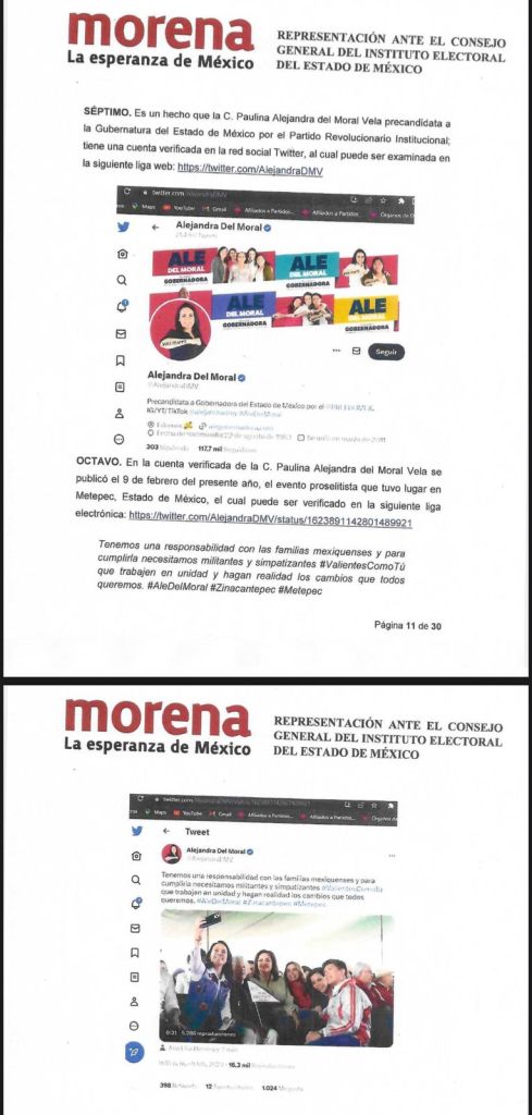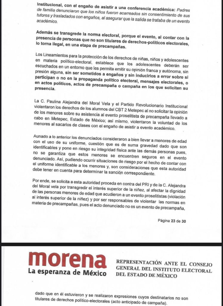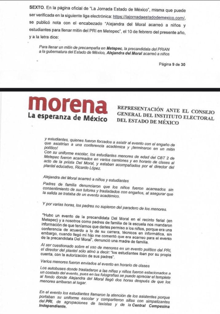 El partido político MORENA presentó ante el Consejo General del Instituto Electoral del Estado de México la denuncia por vulneración del interés superior del menor y actos anticipados de campaña, atribuible al Partido Revolucionario Institucional y su precandidata única, Alejandra del Moral Vela.