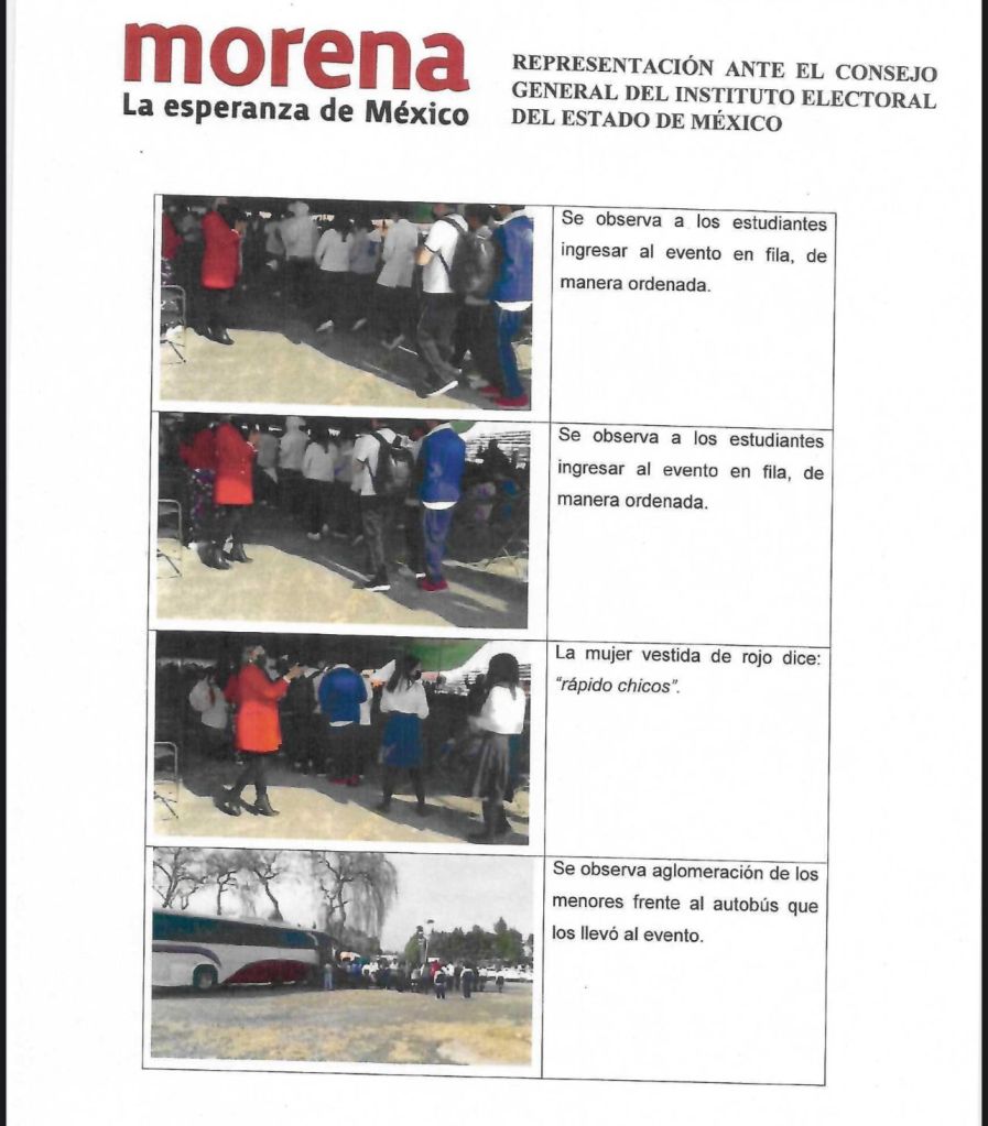 De acuerdo a la queja presentada por MORENA, se señala que la materia de la denuncia se debe al traslado de jóvenes estudiantes de un plantel educativo de Metepec a un evento con fines electorales.