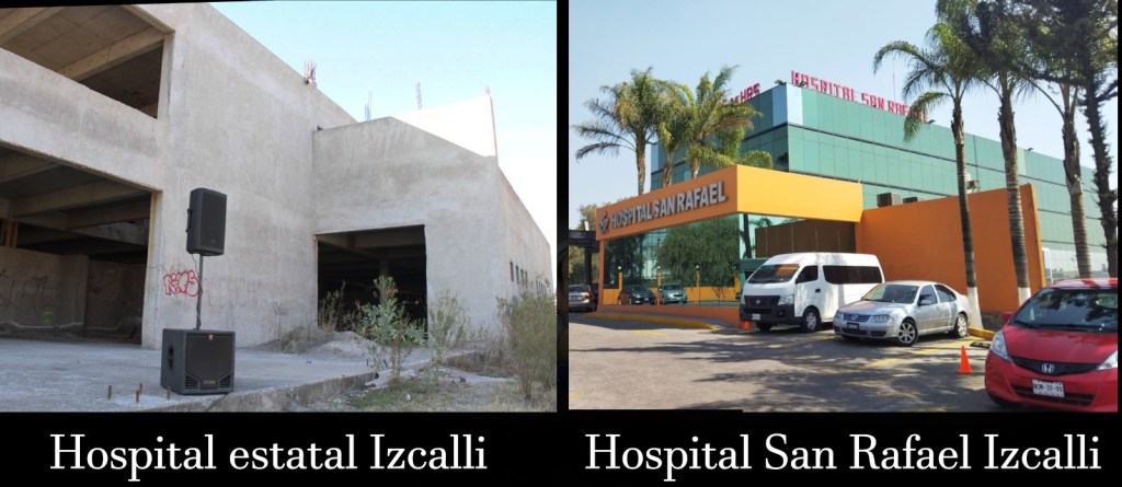 En Cuautitlán Izcalli, se inició en 2014 un hospital que contaría con 18 camas, en el periodo del ex gobernador y hoy senador Eruviel Ávila, gastaron 110 millones de pesos, contaría con servicios de ginecología, cirugía general, pediatría, rayos x, nutrición, psicología y urgencias, debió ser terminado en 2015 pero hoy sigue en obra negra, sin ningún tipo de equipamiento y no será concluido por el actual gobierno estatal.