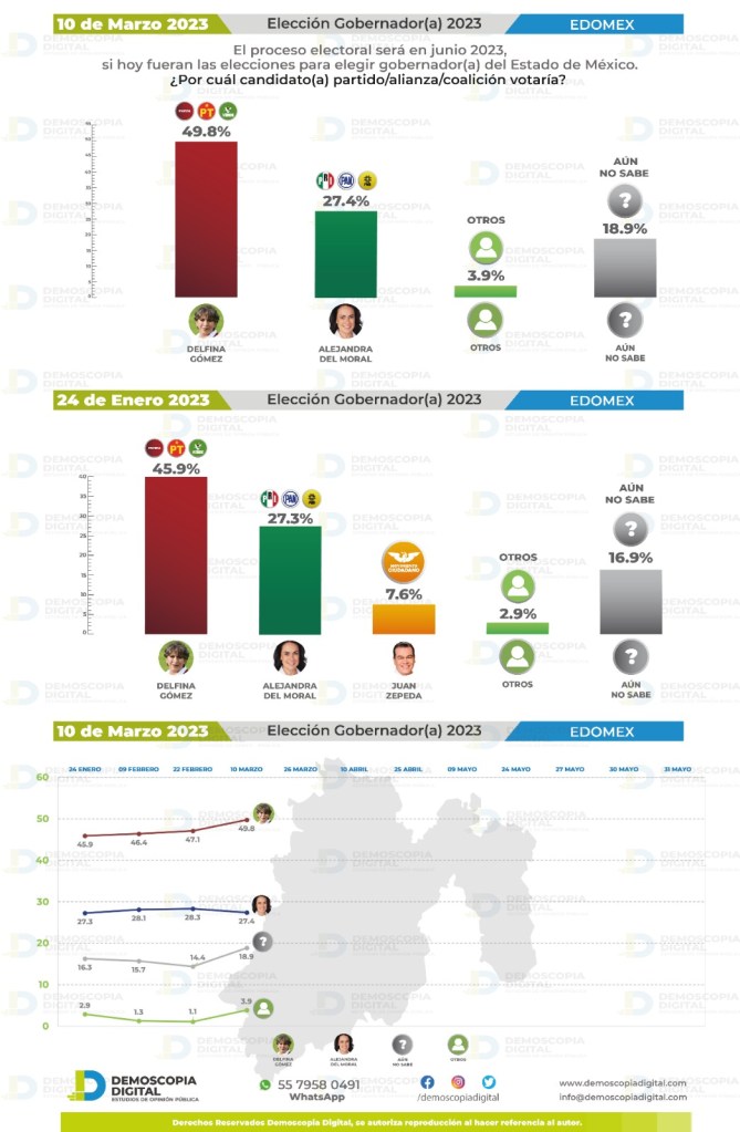 Con los 49.8 por ciento de intención de voto en dicha encuesta del 10 de marzo, la primera sin el nombre de Juan Zepeda en el cuestionario, la maestra Delfina Gómez está a 22.4 puntos por encima de Alejandra del Moral, quien tiene 27.4 por ciento.