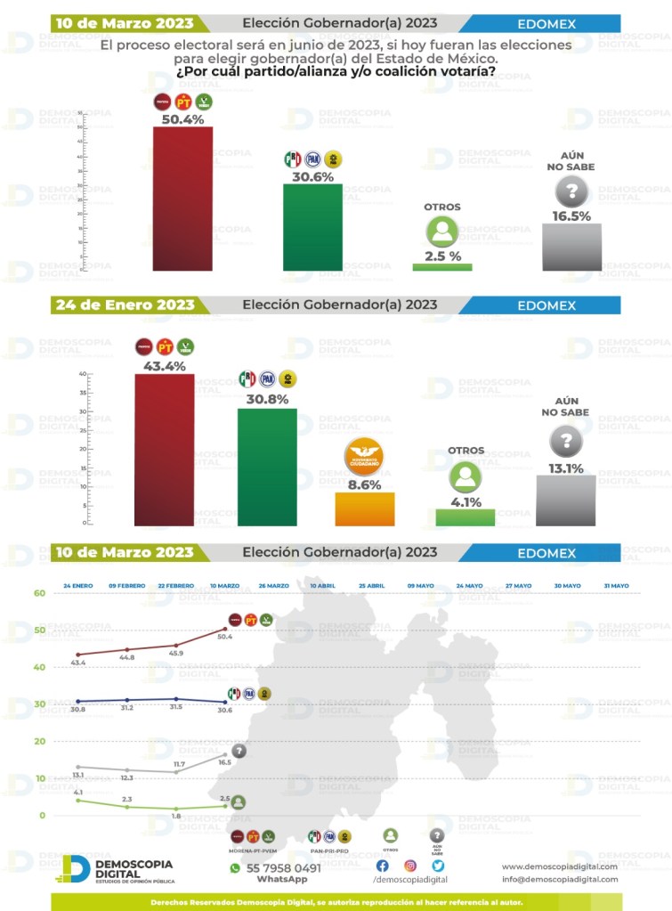 En el referido estudio del 10 de marzo, a la pregunta: “El proceso electoral será en junio de 2023, si hoy fueran las elecciones para elegir gobernador (a) del Estado de México ¿Por cuál partido/alianza y/o coalición votaría?, como se adelantó, el 50.4 por ciento de las personas encuestadas respondieron por MORENA y sus aliados; mientras que el 30.6 por ciento señaló que por el bloque conformado por el PRI, PAN y PRD.