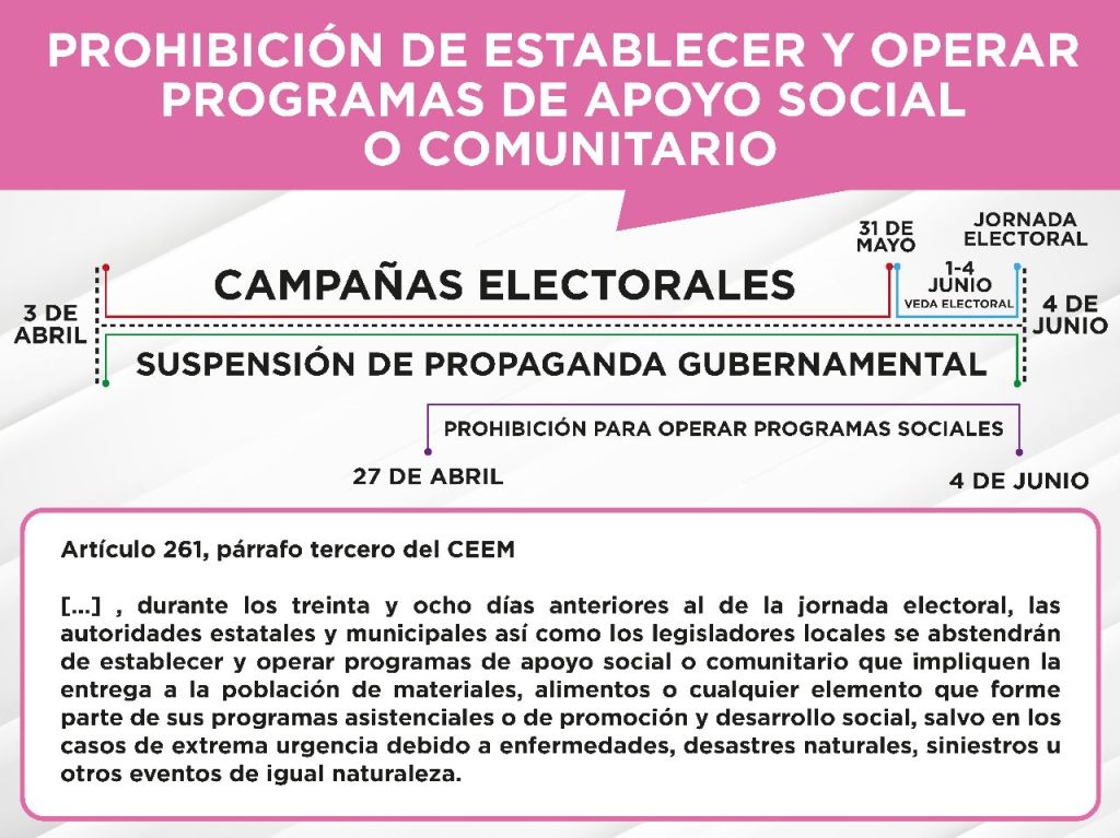 El articulo 261 del Código Electoral del Estado de México establece que durante los 38 días anteriores a la jornada electoral, las autoridades estatales y municipales, así como los legisladores locales se abstendrán de establecer y operar programas de apoyo social o comunitario que impliquen entrega a la población de materiales, alimentos o cualquier elemento que forme parte de sus programas asistenciales o de promoción y desarrollo social, salvo en los casos de extrema urgencia debido a enfermedades, desastres naturales, siniestros u otros eventos de igual naturaleza.