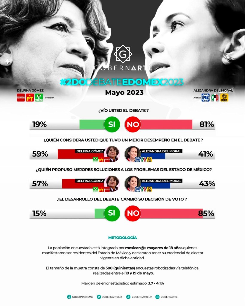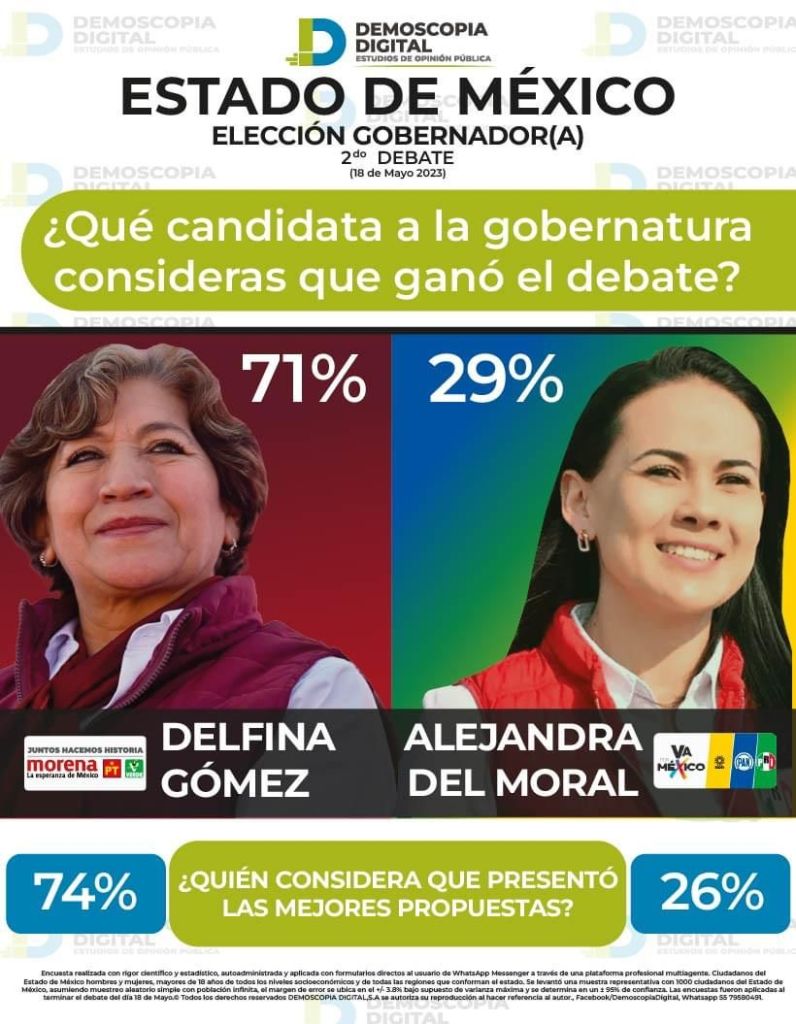 Asimismo, esta misma casa encuestadora señaló que a pregunta expresa de “¿quién considera que presentó las mejores propuestas”, la candidata morenista Delfina Gómez obtuvo el 74 por ciento de las preferencias, mientras que el 26 por ciento consideró a Alejandra del Moral.