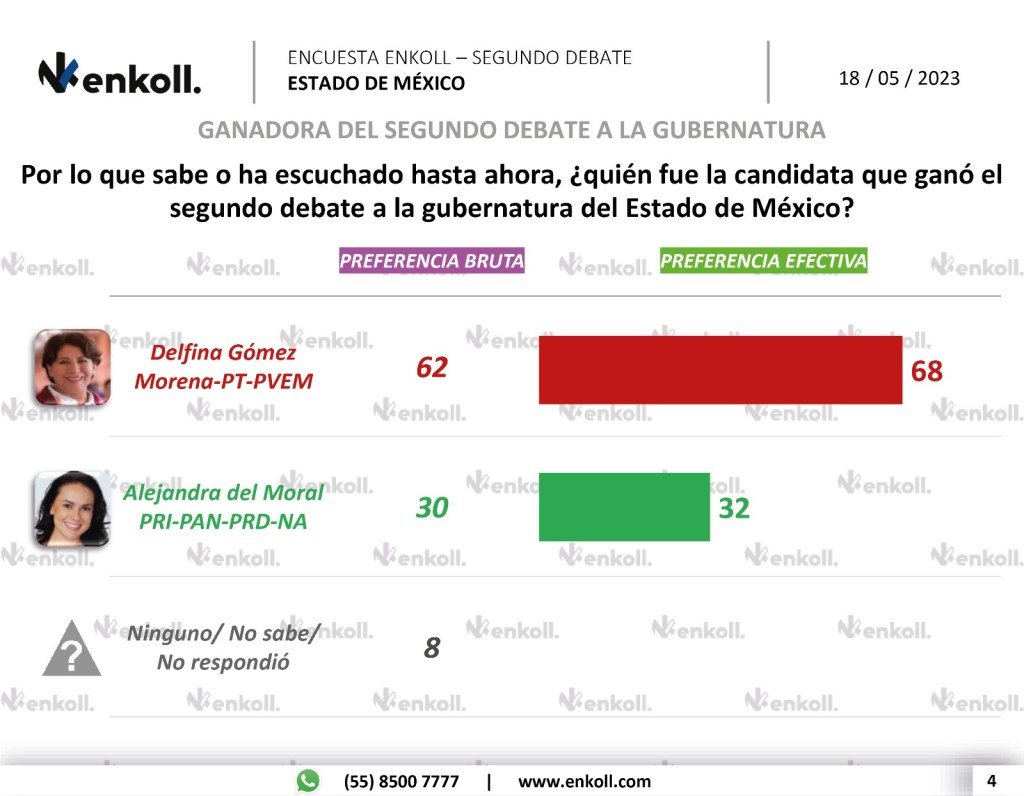 En su estudio de opinión, la encuestadora Enkoll dio a conocer que la maestra Delfina Gómez fue la candidata que ganó el segundo debate a la gubernatura del Estado de México, así lo afirmó el 68 por ciento de las personas encuestadas, en tanto, el 32 por ciento indicó que fue Alejandra del Moral.