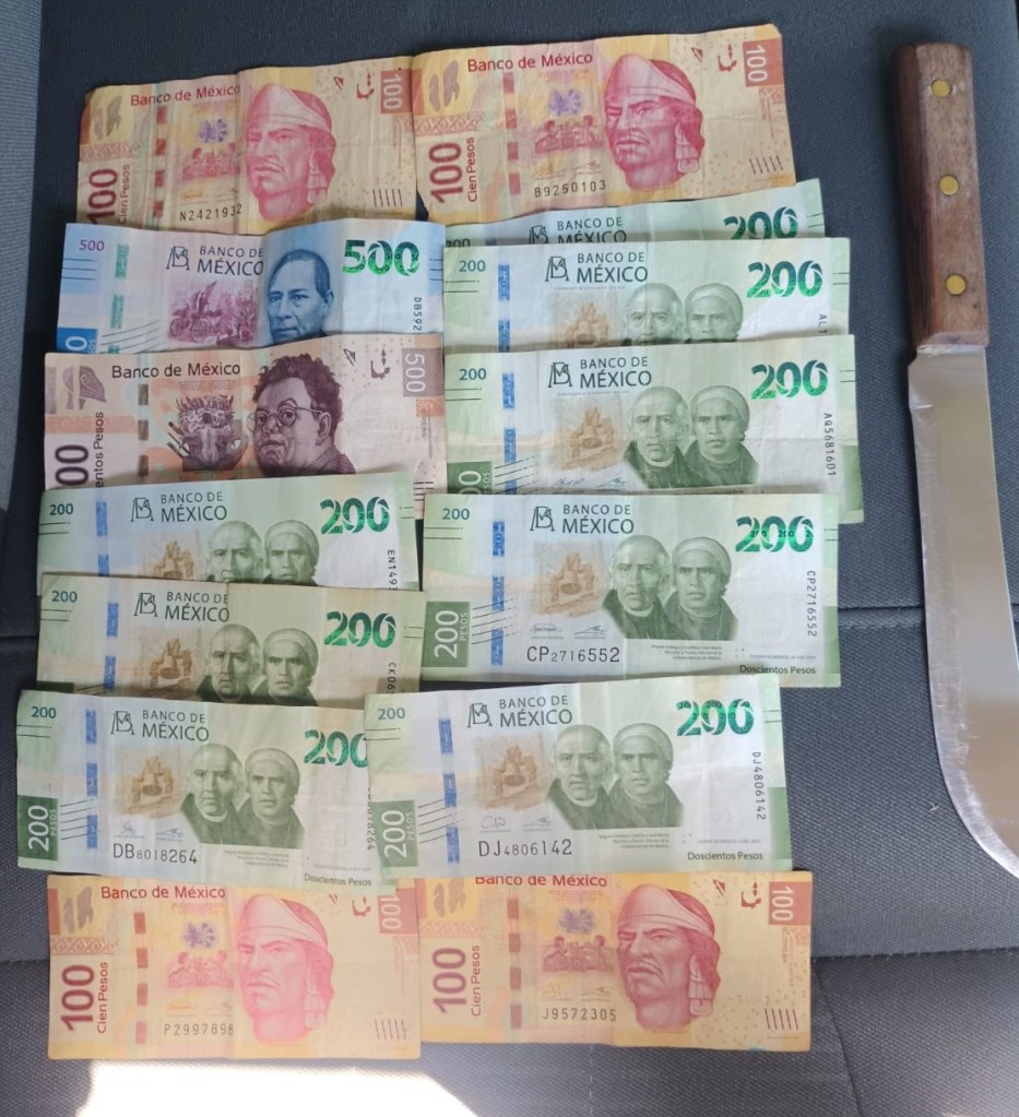 Los policías municipales aseguraron al señalado malhechor, quien dijo llamarse José Manuel “N”, de 45 años de edad, a quien se le realizó una inspección a su persona en la cual entre su ropa se encontró un arma blanca y dinero en efectivo, el cual coincidió con el mismo monto que la víctima reconoció haber entregado.