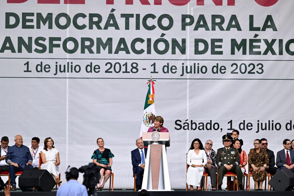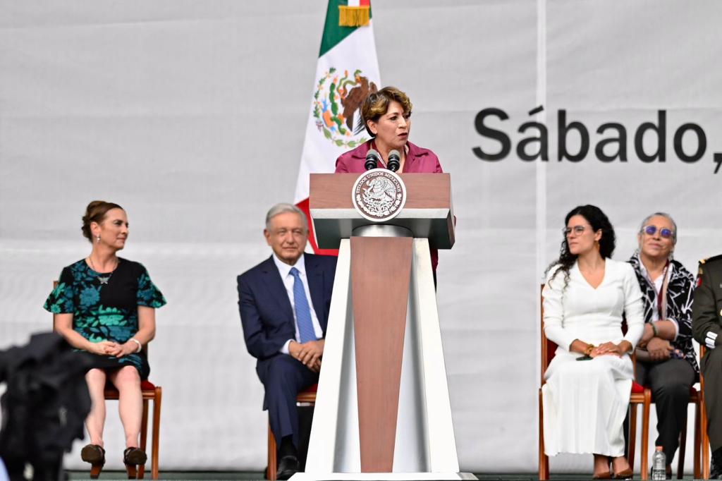 Ante un Zócalo capitalino lleno, la maestra Delfina Gómez agradeció a la ciudadanía por confiar en la Cuarta Transformación.