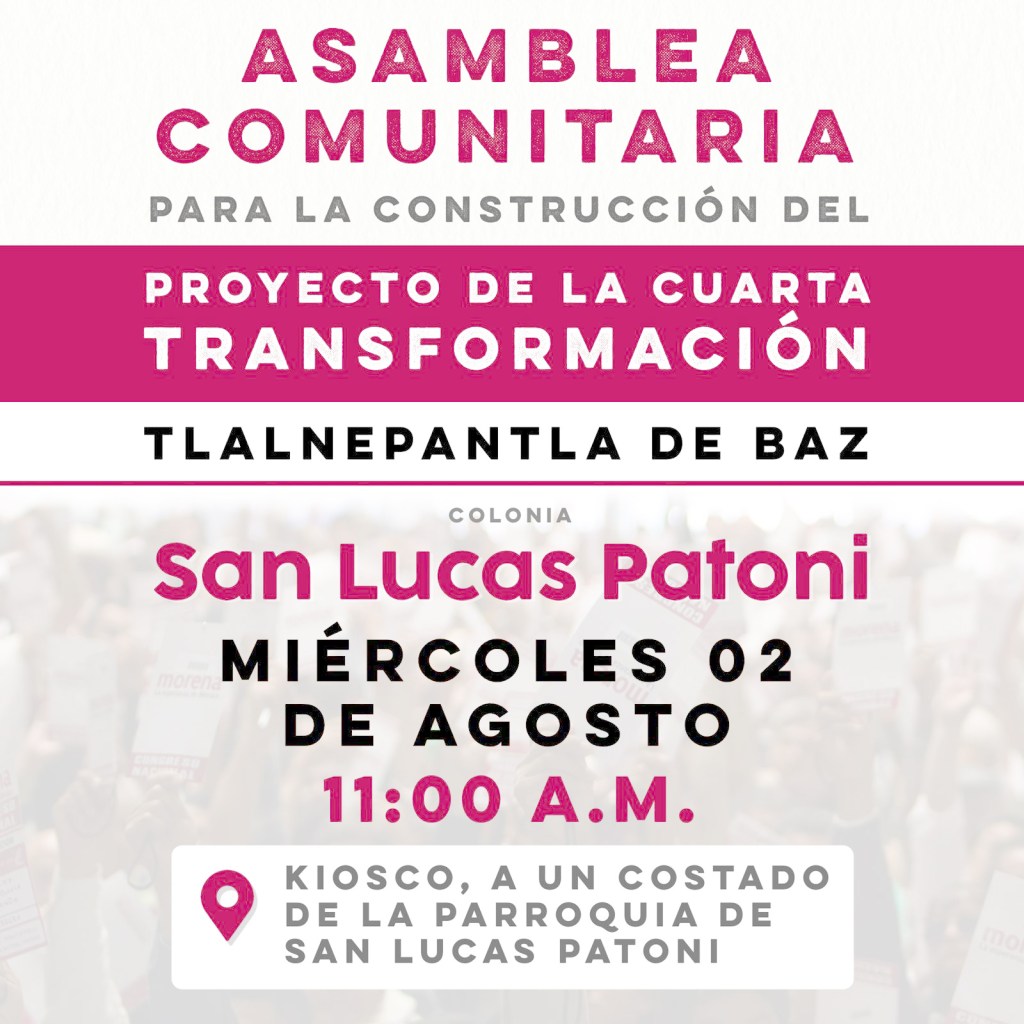 Tlalnepantla, Méx. A partir del miércoles 2 de agosto iniciará la elaboración del “Plan para Construcción del Proyecto de la Cuarta Transformación de Tlalnepantla de Baz”, en el que habitantes del municipio podrán participar mediante asambleas comunitarias para decidir cómo se debe dar la continuidad del movimiento para el 2024.