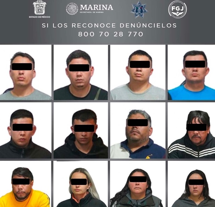 Atizapán de Zaragoza, Méx.- Resultado de una acción conjunta, agentes de la Fiscalía General de Justicia estatal (FGJEM), de la Secretaría de Marina (SEMAR) y de la policía de este municipio, detuvieron a 12 personas que conforman un grupo delictivo dedicado al robo a casa habitación con violencia, tanto en municipios mexiquenses como en el estado de Querétaro. Entre los detenidos hay 6 sujetos de nacionalidad colombiana.