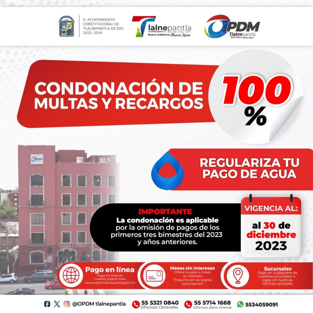 Tlalnepantla, Méx. – El presidente municipal de Tlalnepantla y el Organismo Público Descentralizado para la Prestación de los Servicios de Agua Potable, Alcantarillado y Saneamiento (OPDM), invitan a la ciudadanía tlalnepantlense a aprovechar el último mes de la condonación del 100% de las multas y recargos en el pago de agua.