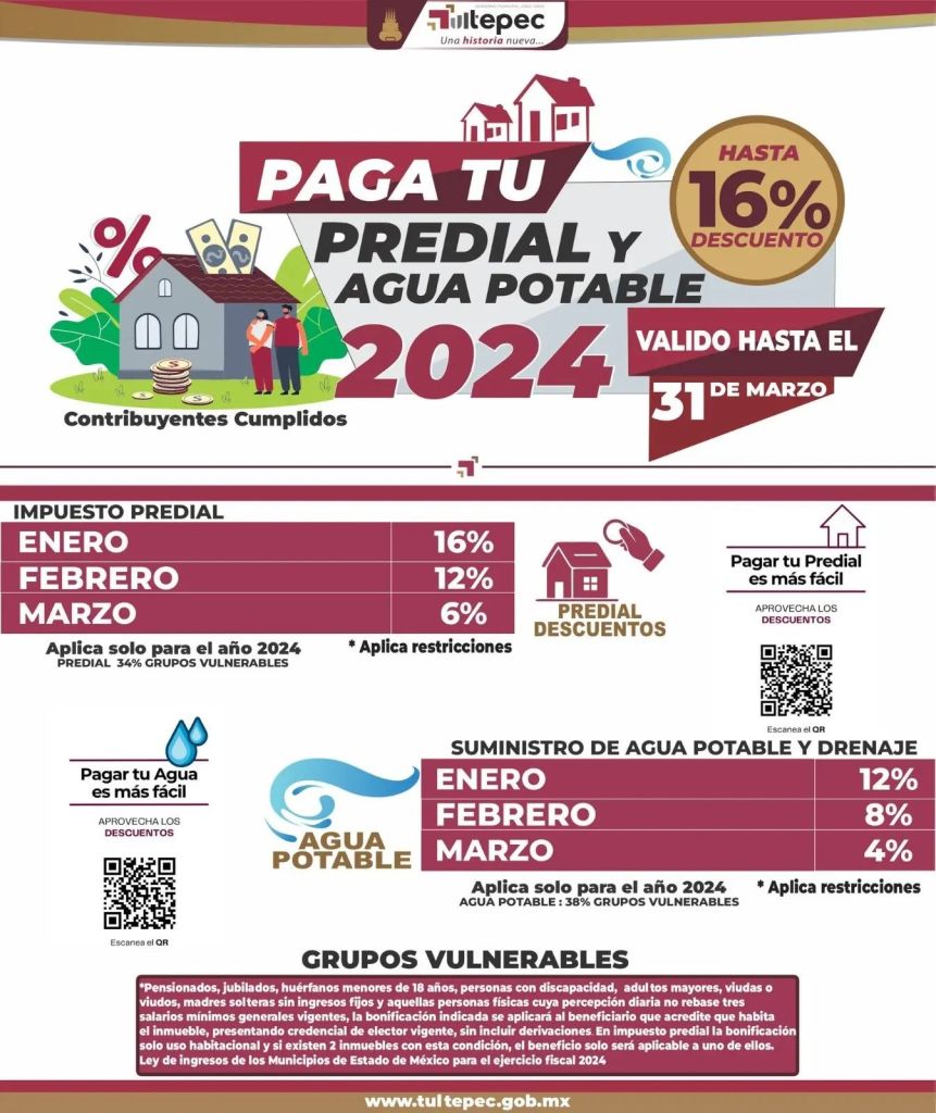 En apoyo a la economía familiar y en línea con la política recaudatoria que impulsa el Alcalde de Tultepec, Sergio Luna Cortes, que considera la situación económica y social de las personas contribuyentes, se mantienen los descuentos en enero 16%, febrero 12% y 6% en el mes de marzo. Para el pago de agua potable enero, febrero y marzo a razón de 12%, 8% y 4%. Comentó el tesorero municipal, contador, Alfonso Martínez Orihuela.