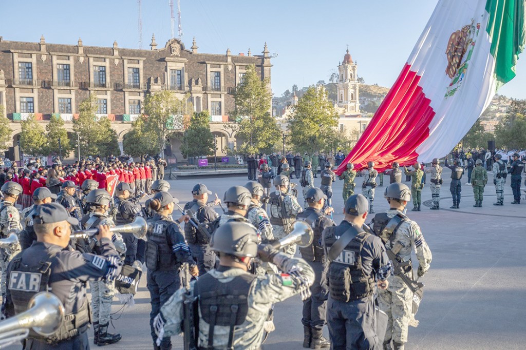 Los elementos de seguridad fueron las encargadas de izar el lábaro patrio, luego de lo cual se entonó el himno nacional y el del Estado de México, interpretados por la Banda Sinfónica del Estado de México, acompañados por la Banda de Guerra combinada de la Guardia Nacional y de la Policía Estatal.